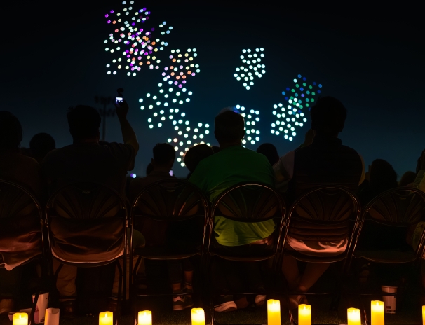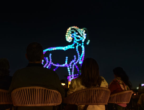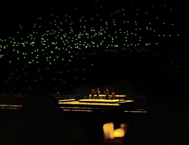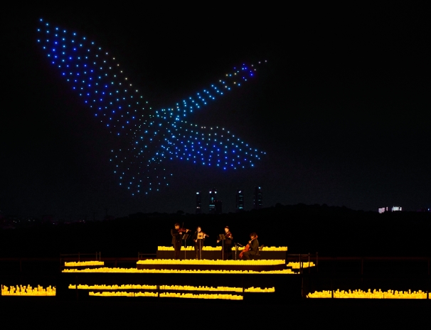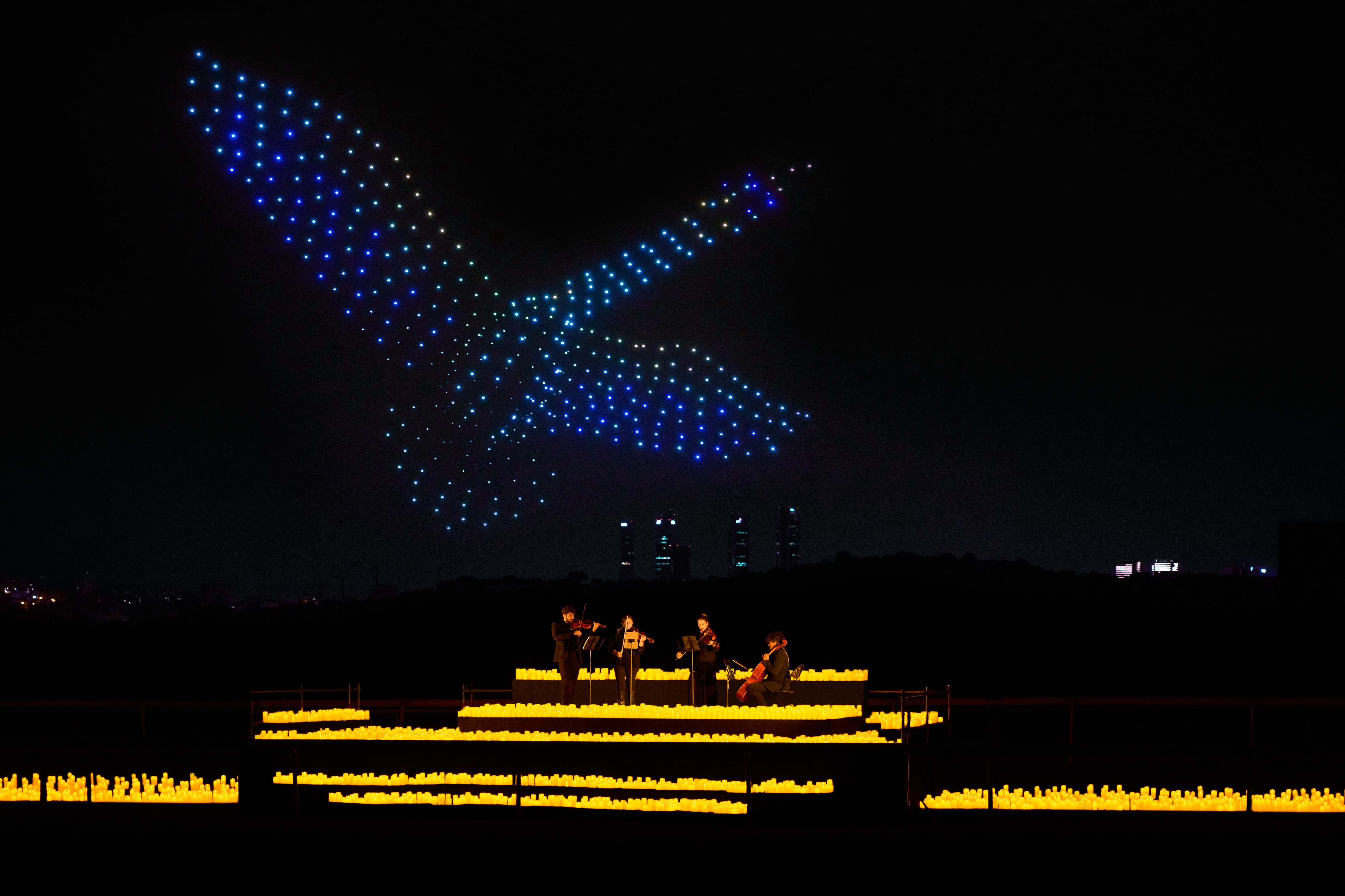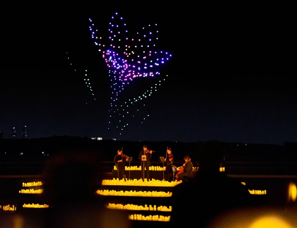 Sota un cel il·luminat per espelmes, un quartet interpreta grans obres mentre centenars de drons pinten figures impossibles sobre el Parc del Fòrum. Una experiència immersiva que eleva els concerts a una altra dimensió i que només es pot viure en primera persona.